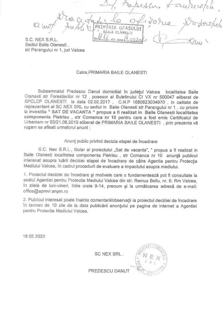 Anunț public SC NEX SRL